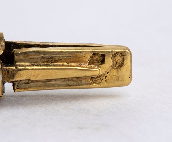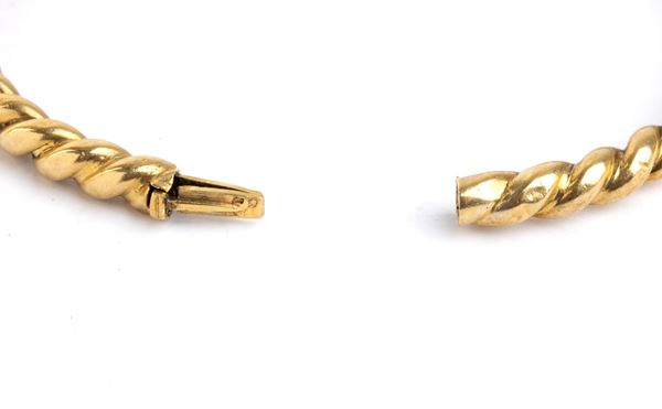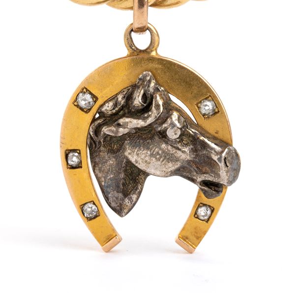 a cord motif rigid hoop 18k yellow gold, from which is suspended a scaramantic pendant depicting a horseshoe, with small diamonds, and a silver horse's head. y