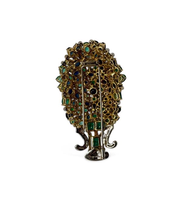 18k yellow and white gold, depicting a vase of flowers, set with diamonds, emeralds and sapphires.