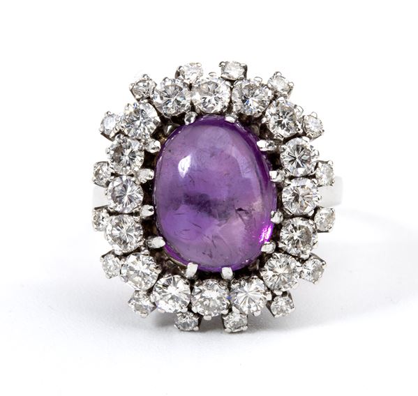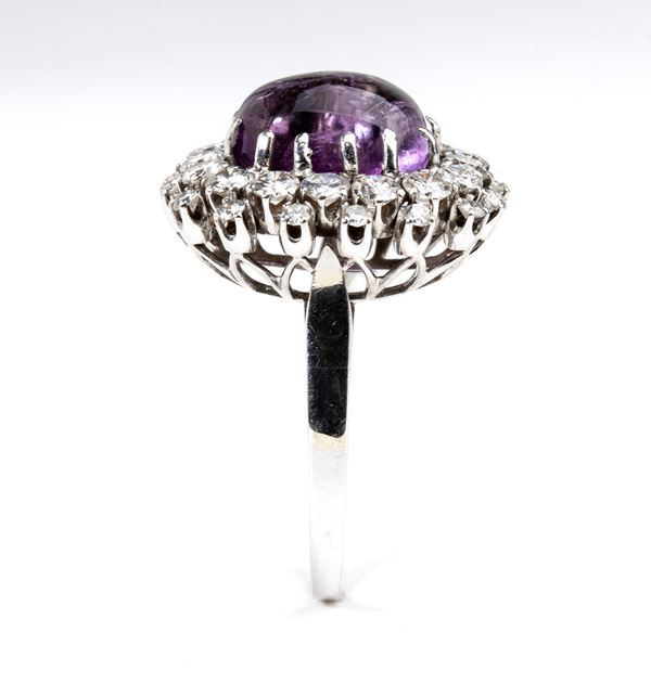 white gold, flower motif, with a double row of diamonds and a central cabochon cut amethyst.