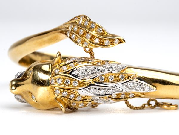 18K yellow gold setting, depicting the head and tail of a lion, embellished by diamonds.