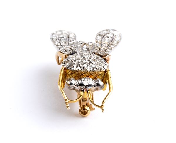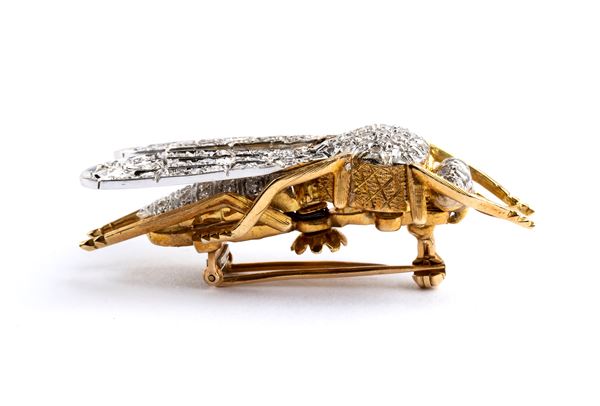 yellow and white gold, depicting an insect with movable wings, embellished with pave set diamonds.