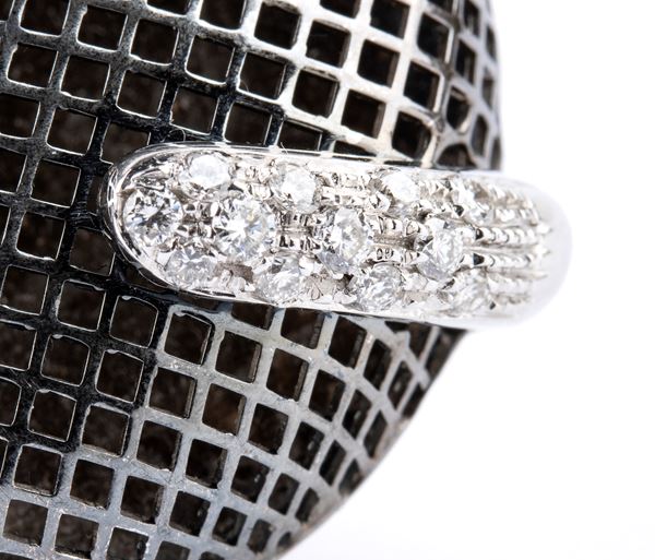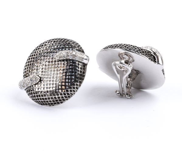 18k white gold with ruthenium plating, each round shape, domed net motif, with small diamond ribbons.