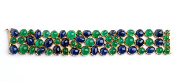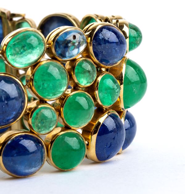 N. 24 blue sapphires, round and oval shape, cabochon cut, approx. 55.00 ct.N. 35 emeralds, round and oval shape, cabochon cut, approx. 45.00 ct.
