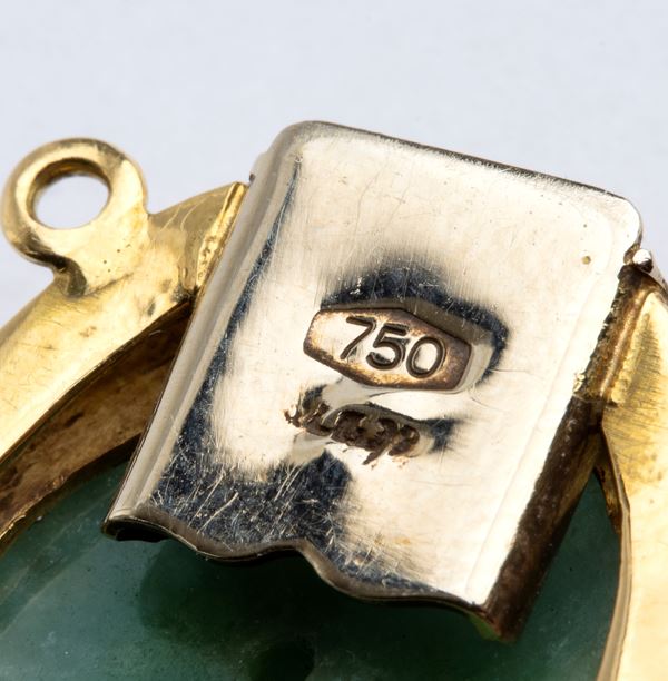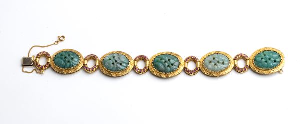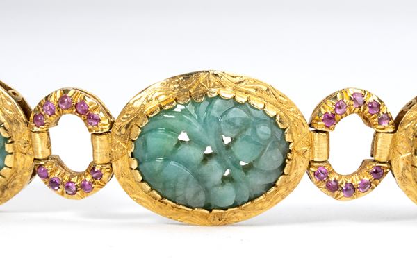 18k yellow gold, with oval links set with floral motifs engraved jade, laced with ring links set with rubies.