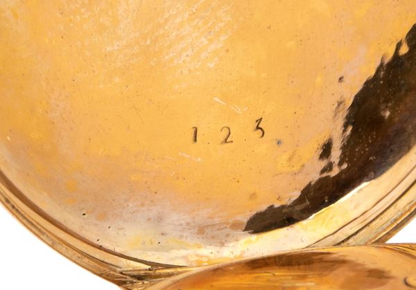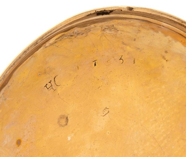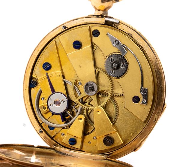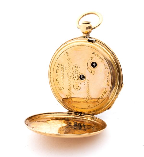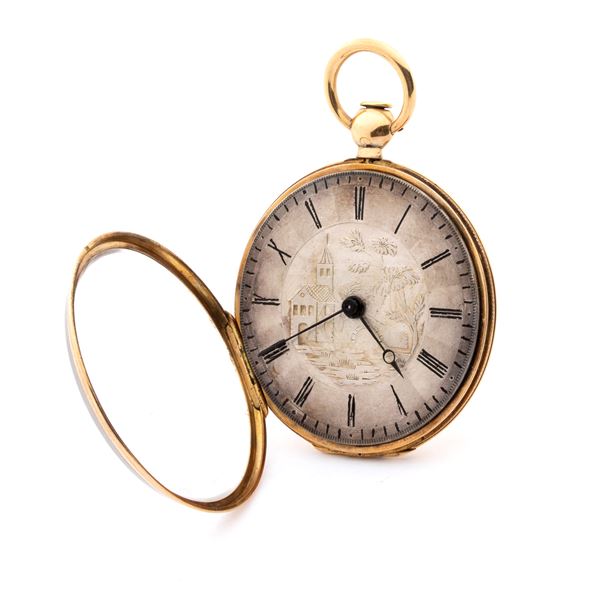 Gold case, decorated engraved dial with Roman hour markers. Mechanical cylinder movement with key-operated winding.