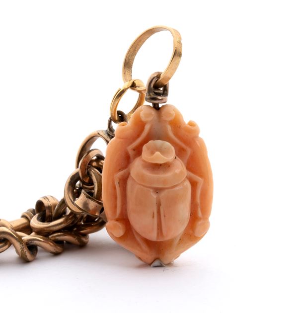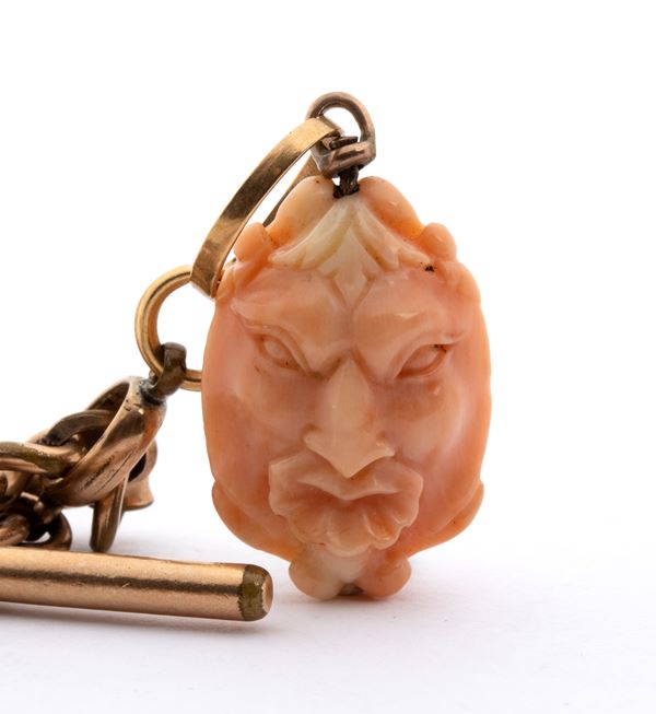 Gold case, white dial with Roman hour markers, gold metal chain and Cerasuolo coral (Corallium Eliatus) pendant.