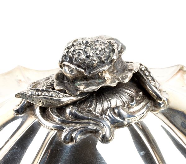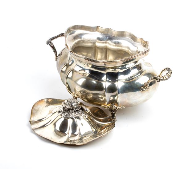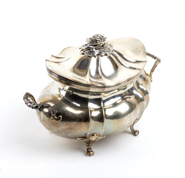 oval shaped, resting on four stylized lion-shaped feet, handles with repeated leaf elements and flower-shaped grip.