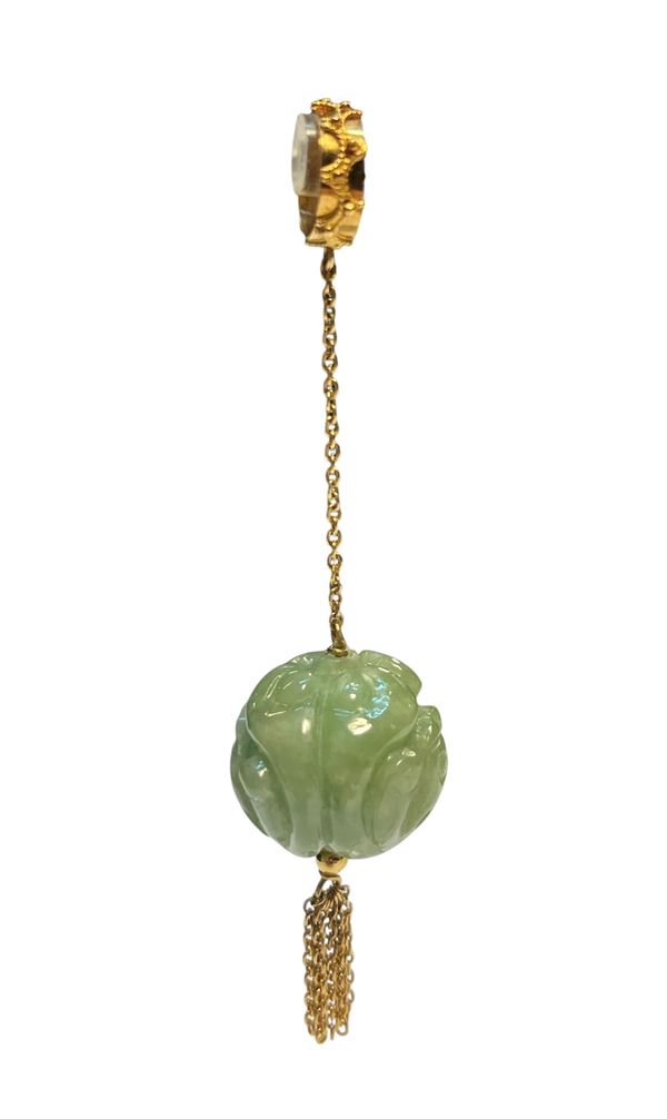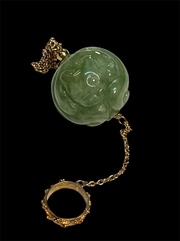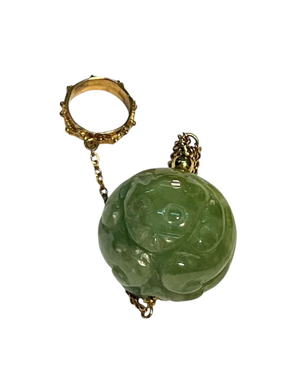 with carved patterned motif jade sphere, suspended from a gold chain.