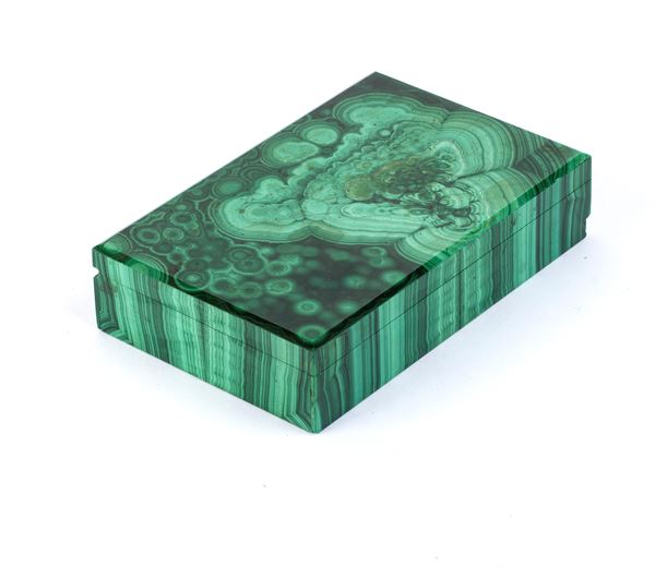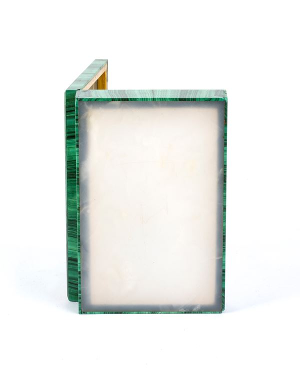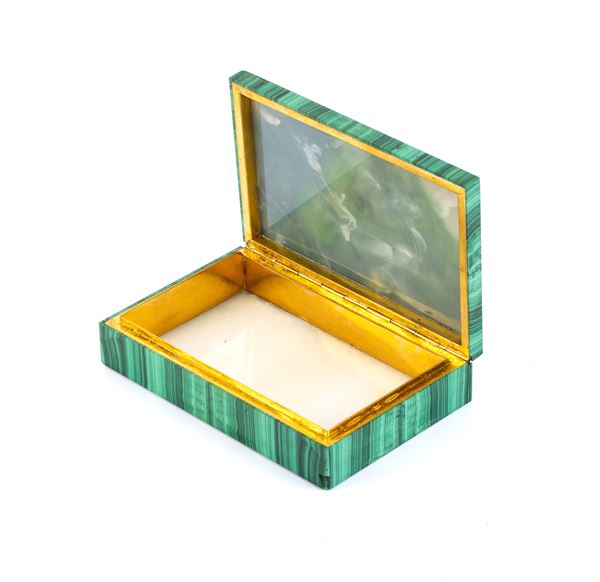 square shape covered over the entire surface with malachite. It has a hinged lid. Internally it is made of gilded silver.