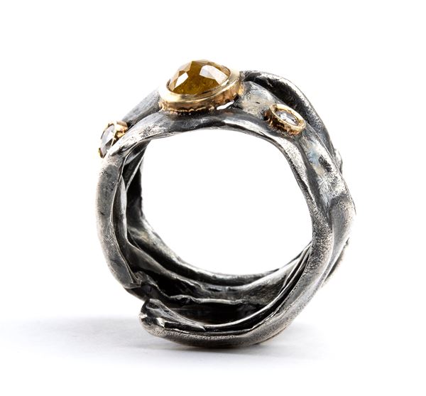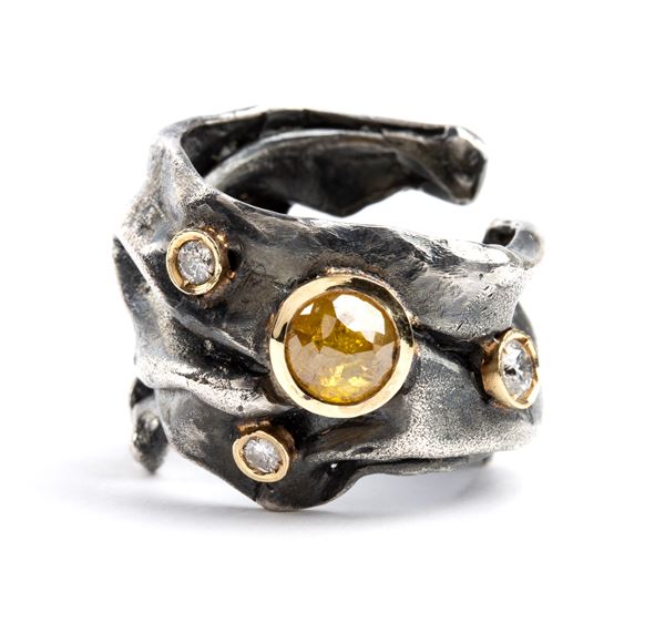 lost wax casting sterling silver, wavy band surface almost resembling a fabric, highlighted by diamonds.