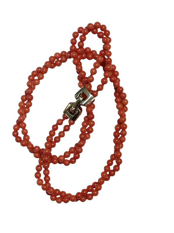two strand of Mediterranean cral Beads (Coralium Rubrum), yellow gold clasp.