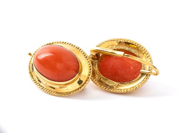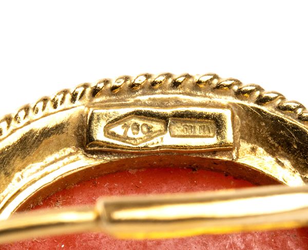 18k yellow gold, set with oval cabochon cut Mediterranean coral (Corallium Rubrum), framed by cord motif.
