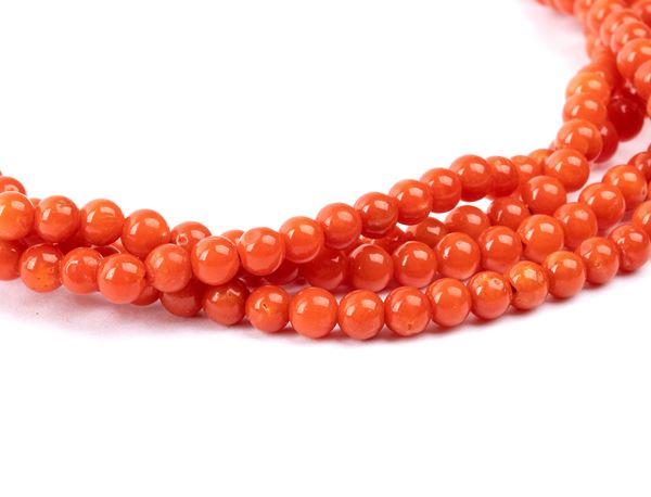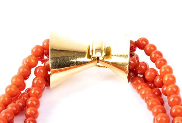 18k yellow gold clasp with four strands of Mediterranean coral beads (Corallum Rubrum).