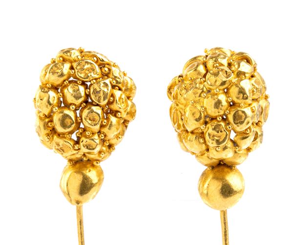 This pair of gold pins dates back to the period between the late Middle Ages and the Renaissance. They were used to fix aristocratic hairstyles and feature a long slender shaft with a relief upper decoration, inspired by natural forms,shows an influence from late-Byzantine goldsmithing.