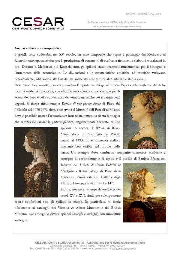 These accessories were very popular among Renaissance noblewomen, often used in pairs to provide balance and stability to hairstyles. The presence of two identical pins suggests a symmetrical use, perhaps to secure a veil, and they could belong to a nuptial or ceremonial set. Analysis of the alloy confirms their dating to the 15th century.