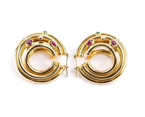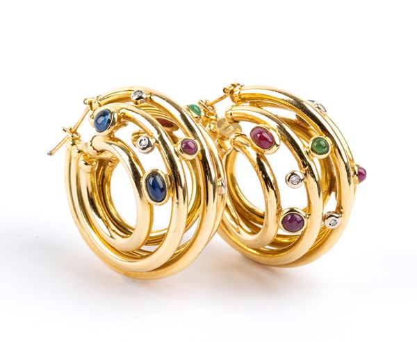 Pair of gold earrings with diamonds, emeralds, rubies, and sapphires, 20th century