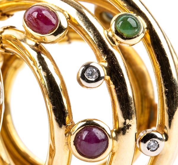 18k yellow gold with 5 rings embellished by diamonds, cabochons cut sapphires, emeralds and rubies. Signed PEREZ.