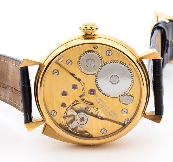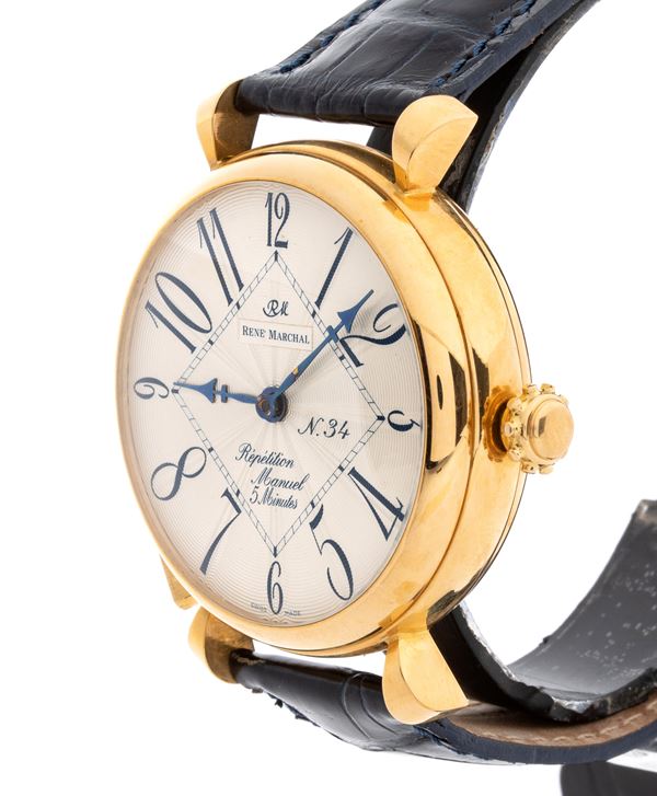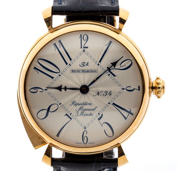 Gold case, leather strap, white sword-worked dial with Arabic hour markers. Hand-wound mechanical movement with hour repeater every 5 minutes. Reference 320826, Number 34. Complete with box and booklet.