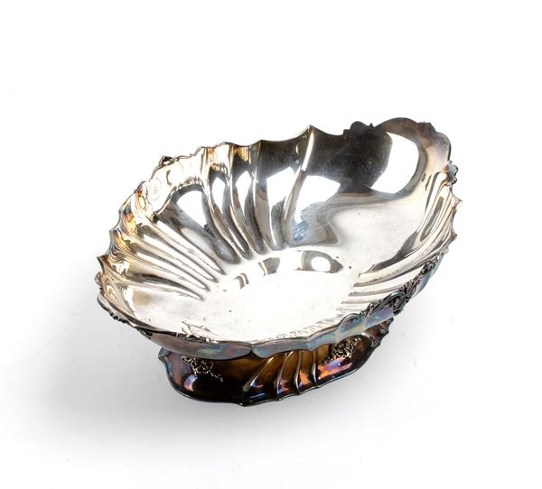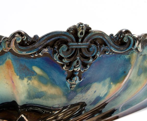 Resting on oval base, with shaped edges decorated with stylized plant elements.