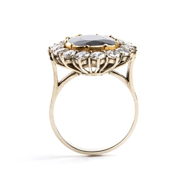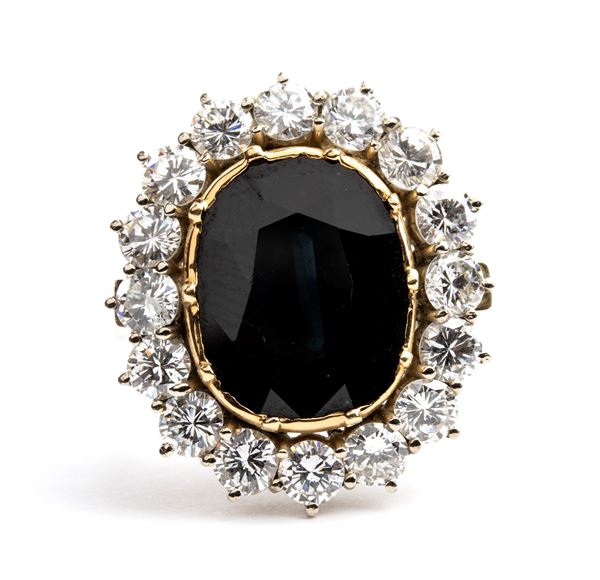 white and yellow gold, set with oval shaped blue sapphire framed by diamonds.