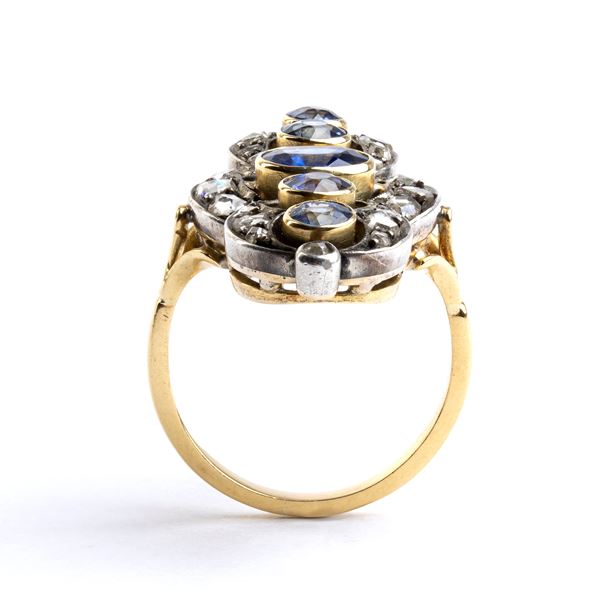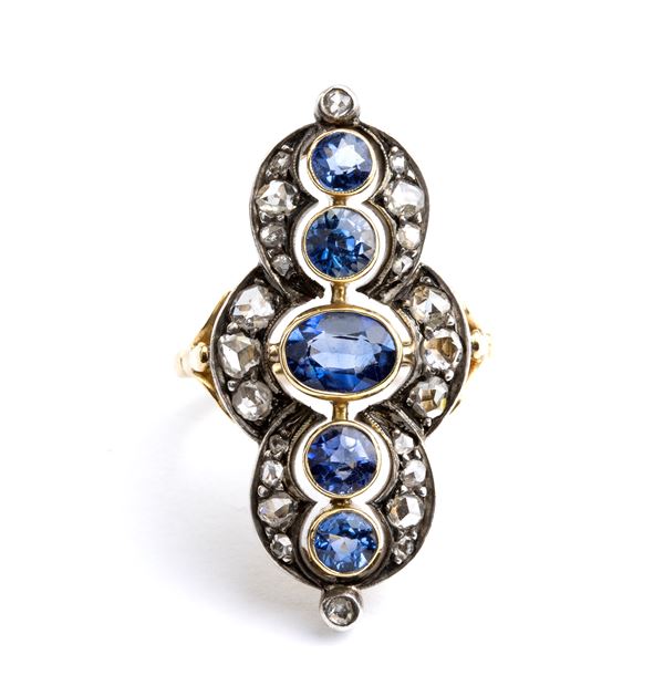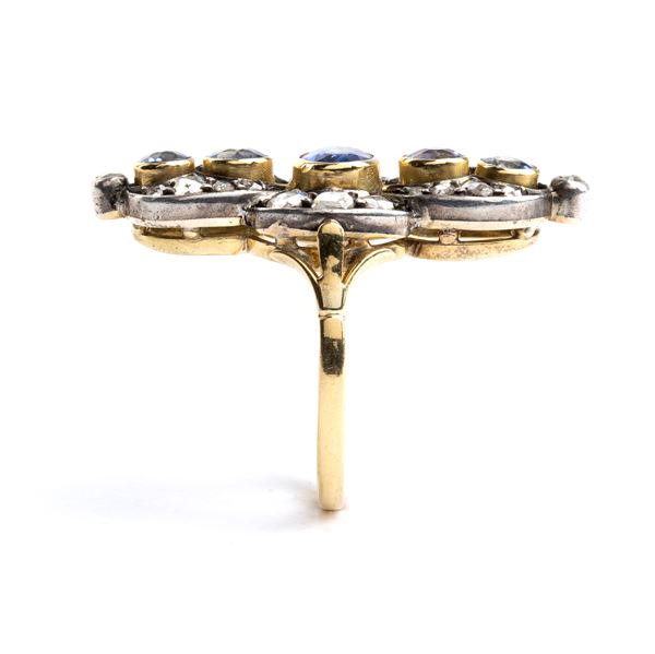 yellow gold and silver setting, poly-lobed shape, with line of blue synthetic sapphires framed by rose cut diamonds.