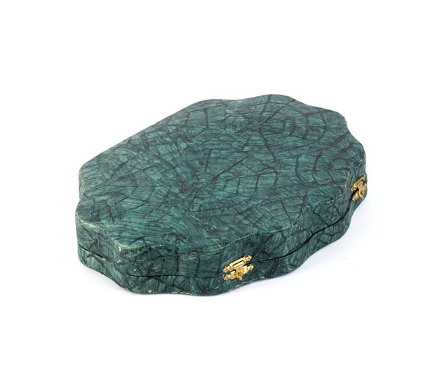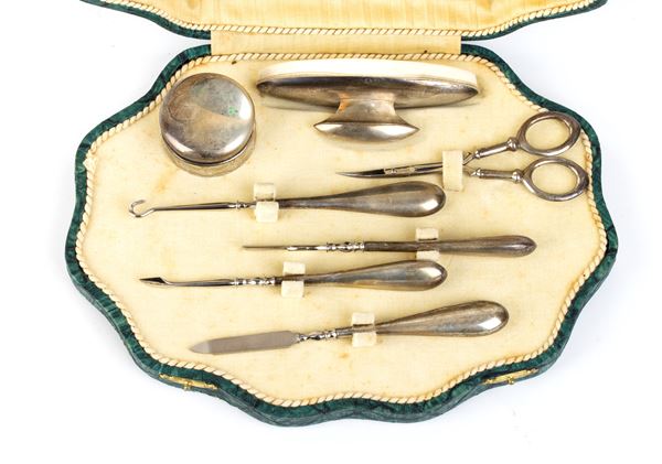 consisting of six manicure tools and a powder compact. The set is housed in its original box, which is shaped and green in color. Inside the box, there is a mirror.