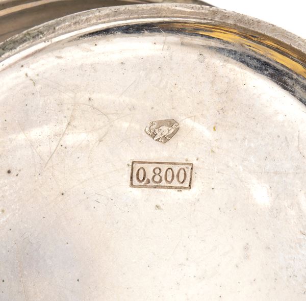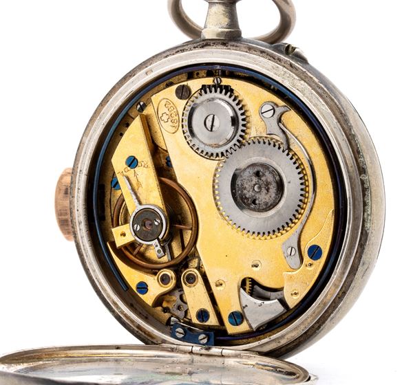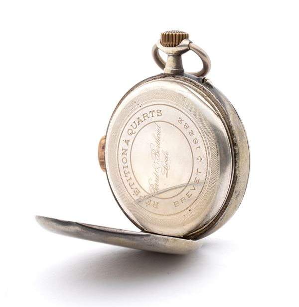 solid silver case, Roman numerals, and white dial with gold decorating spheres. Hour and half-hour repeater watch. With chain.