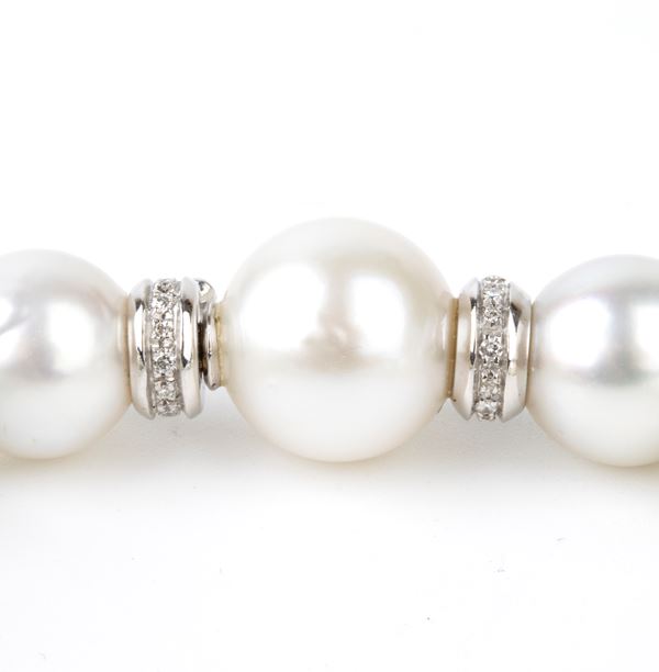 one strand of Australian and Tahitian graduated pearl necklace. 18k white gold spacers set with round brilliant cut diamonds, approx. 0.55 ct. F-G, VS.