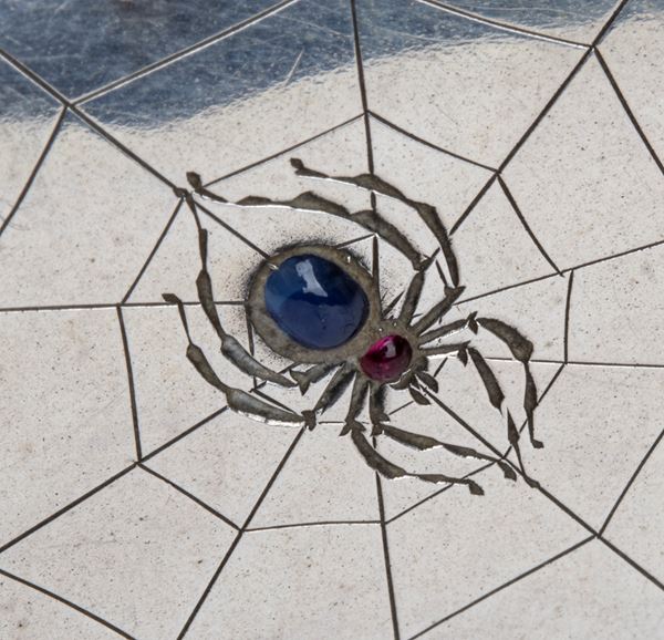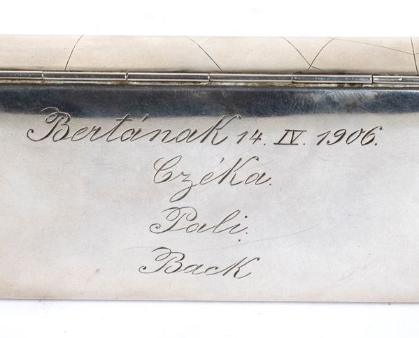 - Coin purse of rectangular shape. It features a spider's web motif embellished with semiprecious stones. On the back it features an engraving: " Bertànak 14, IV 1906. Czèka. Pali. Back.". The item is enriched by a chain.