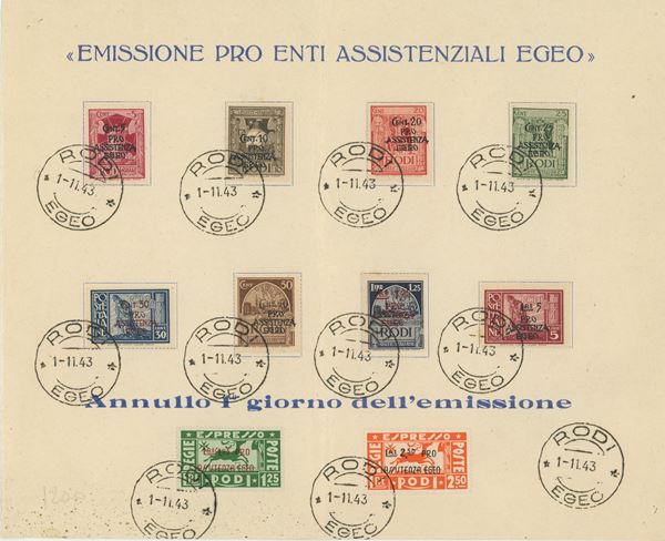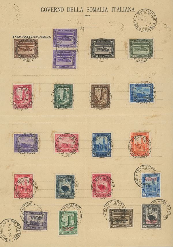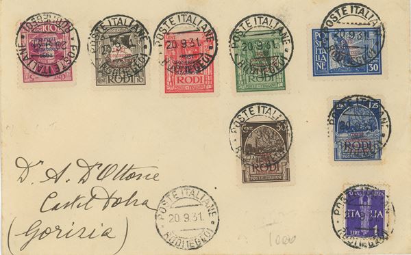 1930 - Egeo, insieme di serie usate su lettera o su foglietti con annulli originali dell'epoca. Presenti le serie di Egeo XXI Congresso Idrologico, Congresso Eucaristico Italiano, Pro Assistenza Sinistrati. Presente anche un foglietto con valori di Somalia delle serie Pittorica del 1932 e ''Onoranze del Duca degli Abruzzi''. Insieme non comune e di sicuro interesse per il collezionista di colonie allo stato di usato, alto valore di catalogo.