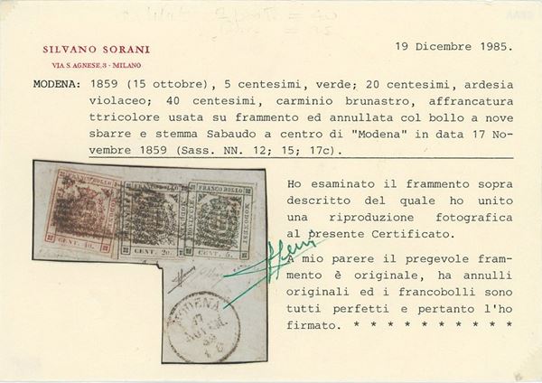 15.10.1859 - Frammento di lettera con rara affrancatura tricolore composta da 5 cent. verde n.12 + 20 cent. ardesia violaceo n.15 + 40 cent. carminio brunastro n.17c, tutti perfetti. Insieme non comune. (A) (Cert. Sorani, Emilio Diena per esteso, Oliva)