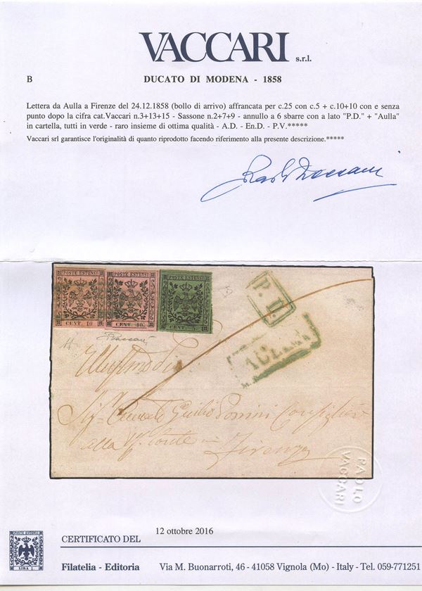 24.12.1858 - Splendida lettera da Aulla per Firenze affrancata per 25 cent. tramite un 10 cent. rosa chiaro senza punto n.2 + 5 cent. verde n.7 + 10 cent. rosa con punto dopo la cifra n. 9. La rara affrancatura รจ impreziosita dalla combinazione di annullamenti: 6 sbarre in azzurro, cartella in azzurro, P.D. in cartella azzurra. (LUX) (Cert. Vaccari, Alberto Diena, Enzo Diena).