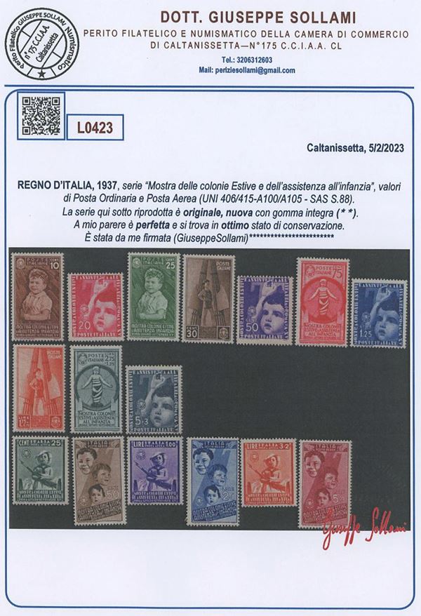 1937 - Colonie estive n.406/415 + A100/A105, nuovi con gomma integra MNH. certificato Sollami.
