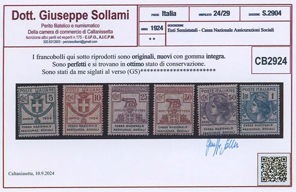 1924 - Cassa Nazionale Assicurazioni Sociali n.24/29, nuovi con gomma integra MNH. Certificato Sollami.