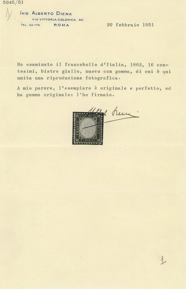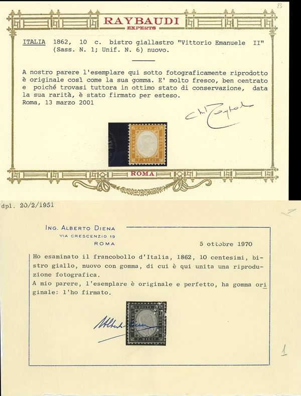 1862 - 10 cent. bistro giallastro n.1 nuovo con gomma originale. Rarissimo in questo splendido stato di conservazione e perfettamente centrato. Due Certificati Alberto Diena e Certificato Raybaudi. Cat. 24.000 euro.