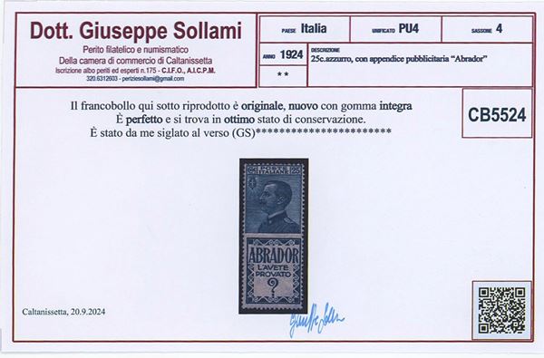 1924 - 25 cent. Abrador n. 4, nuovo con gomma integra MNH. Certificato Sollami.