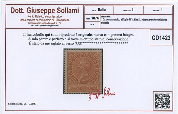 1874 - 10 cent. n.1, nuovo con gomma integra MNH. Certificato Sollami.