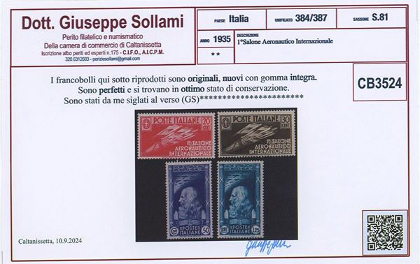 1935 - Salone Aeronautico n.384/387, nuovi con gomma integra MNH. Certificato Sollami.