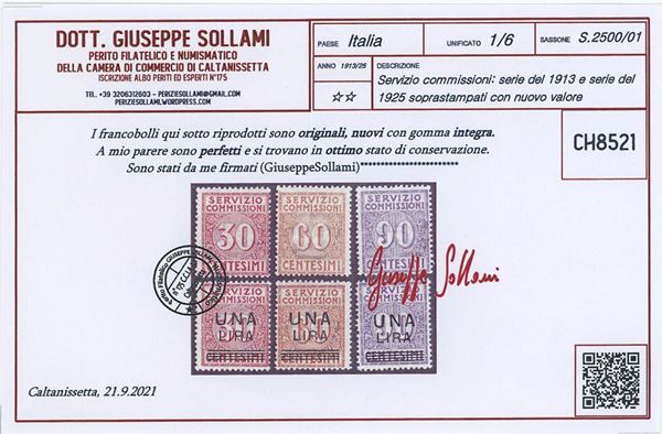 1913 - Servizio commissioni, le due serie n.1/3 + 4/6, nuove con gomma integra MNH. Certificato Sollami.