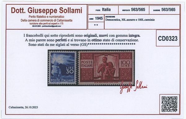 1945 - Democratica, 30 e 100 Lire n.563 e 565, nuovi con gomma integra MNH. Certificato Sollami, il 100 lire firmato Raybaudi.