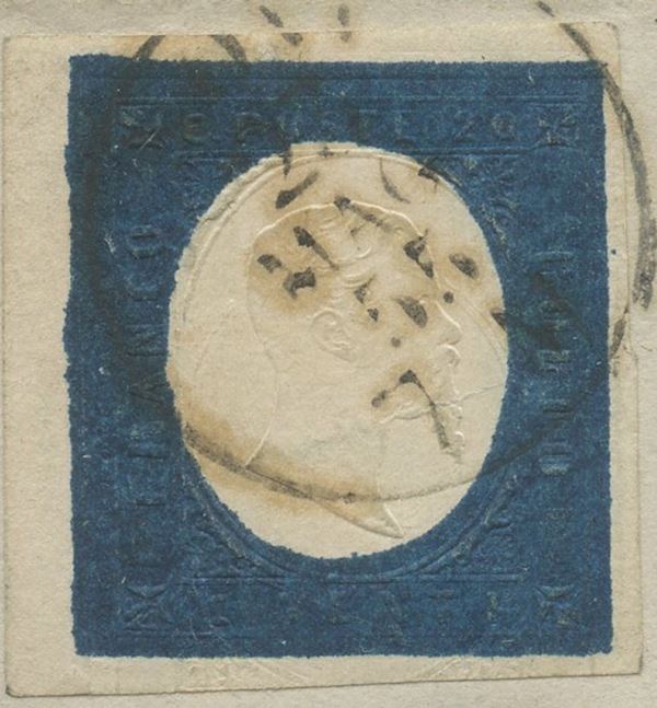 23.05.1855 - 20 cent. azzurro n.8 usato a Genova e conservato su frammento di lettera. Quest esemplare è da considerarsi particolarmente pregiato per via di una doppia impronta a secco di cui una molto spostata in basso risultando '' a cavallo''. MOlto raro e di ottima qualità. (LUX)