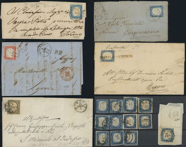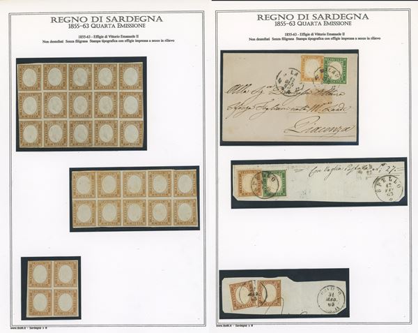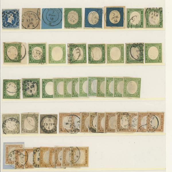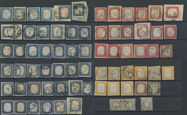 1855 -Insieme delle diverse emissioni del regno di Sardegna. Notate numerose tonalità non comuni della IV emissione di Sardegna ed alcuni annullamenti altrettanto interessanti. Alto valore di catalogo e qualità mista, mediamente buona.