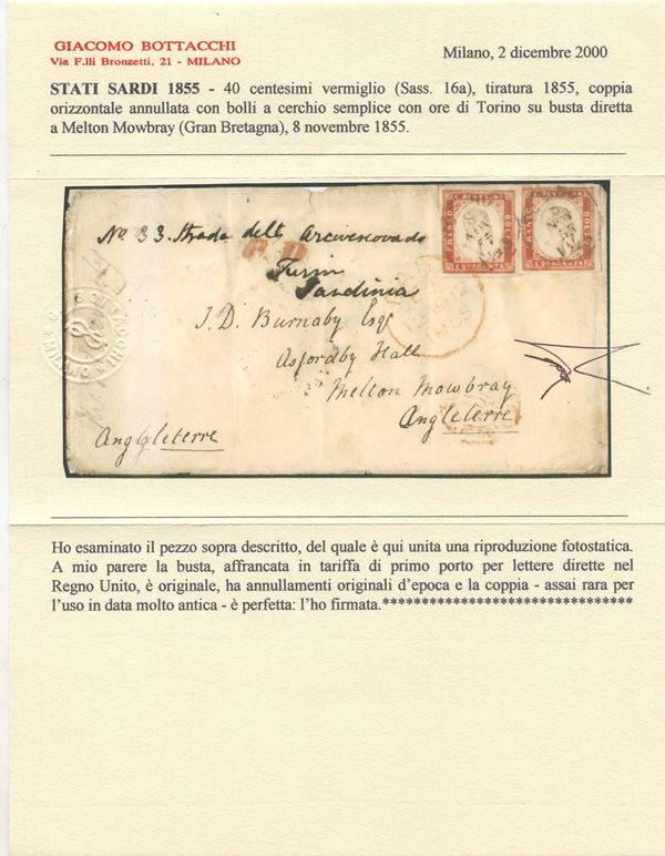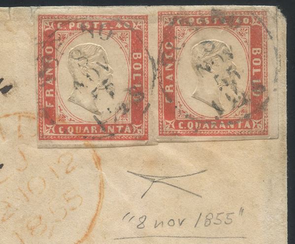 08.11.1855 - Busta da Torino per Londra affrancata tramite due valori da 40 cent. vermiglio n.16a, entrambi ben marginati e freschissimi. Rari i 40 cent. usati nel 1855, specialmente se conservati su documento. Cat. 17.500. (A+) (Cert. Bottacchi)