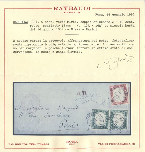 16.06.1857 - Busta da Nizza Marittima per Parigi affrancata per 50 cent. tramite una coppia del 5 cent. verde mirto n.13A + 40 cent. rosso scarlatto n.16A, tutti di ottima qualità. Raro insieme. CAt. 8.675. (LUX) (Cert. Raybaudi, Alberto Diena)