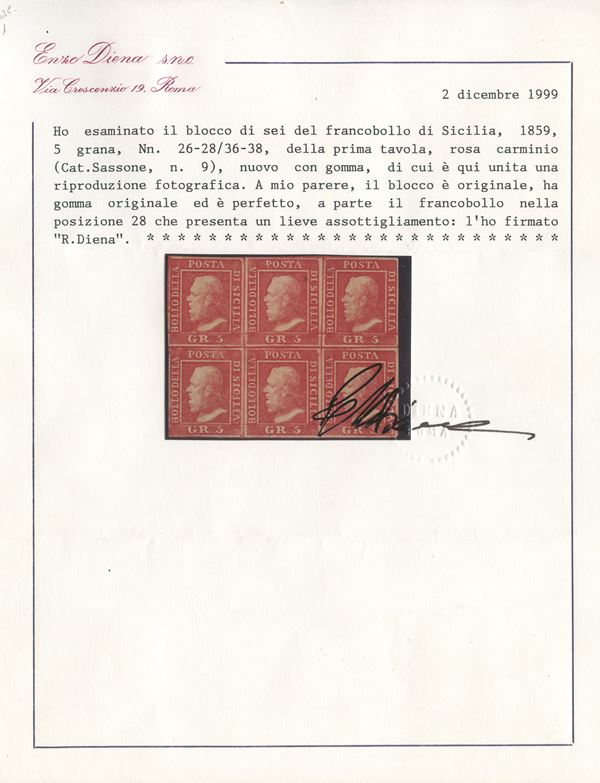 1859 - 5gr. rosa carminio n.9 in splendido blocco di 6 nuovo con gomma originale, linguellato. Raro. Cat. 17.500++. (A+/A-) (Cert. Diena, Alberto Diena)