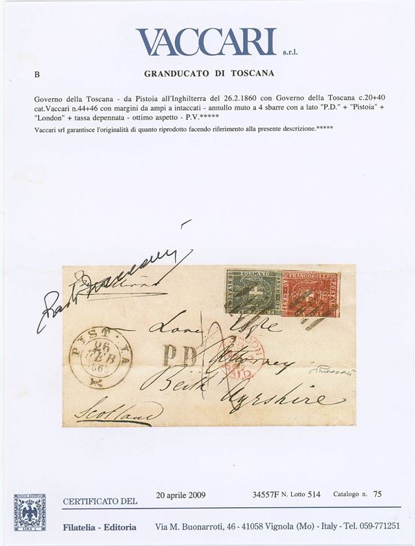 26.02.1860 - Busta da Pistoia per l'Inghliterra affrancata per 60 centesimi tramite un 20 cent. azzurro n.20 ed un 40 cent. carminio n.21. Sull'affrancatura il muto di Pistoia a 4 sbarre. Insieme non comune. (B) (Cert. Vaccari)