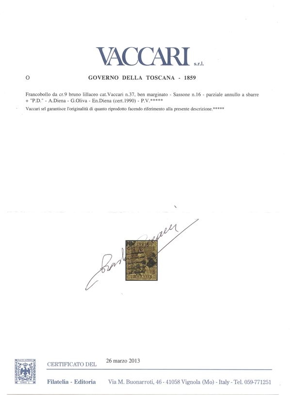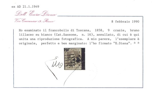 1859 - 9 cr. bruno lillaceo con filigrana a linee ondulate n. 16, usato e di ottima qualità. Il raro esemplare è accompagnato da due certificati Vaccari e Enzo Diena. Molto raro così ben marginato. Cat. 12.000 euro. (A+) (Cert. Vaccari, Cert. Enzo Diena, Alberto Diena)