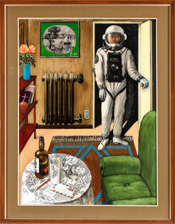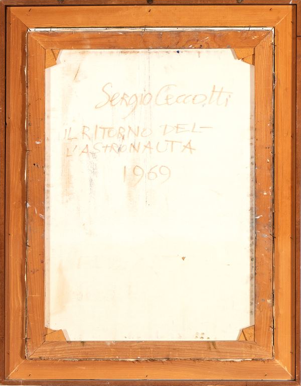 Signed and dated upper left: SC, 1/69. Signed, dated and titled on the back: Sergio Ceccotti, Il ritorno dell'astronauta, 1969.