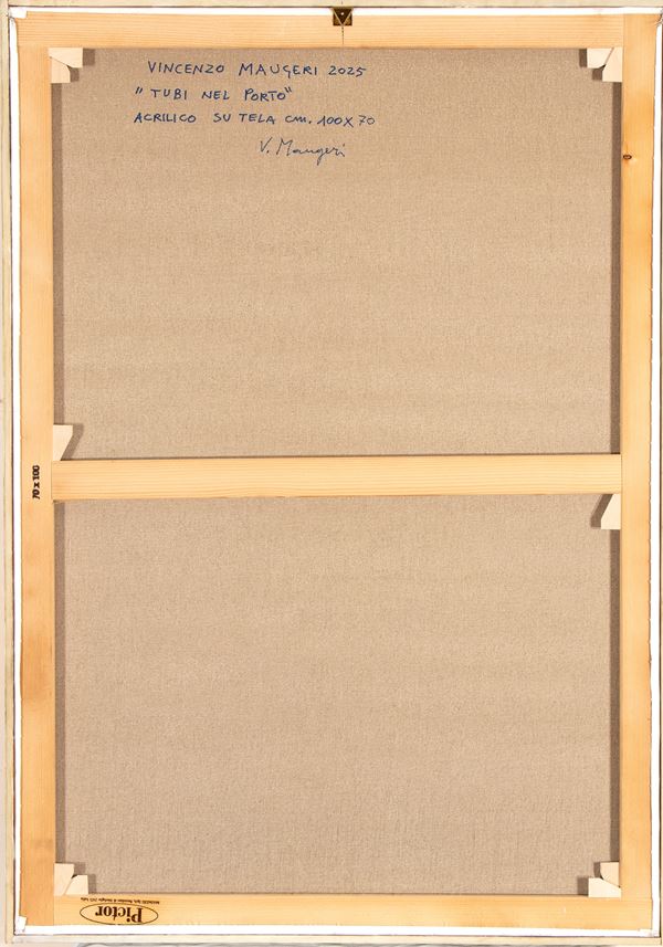 Signed and dated lower right: V. Maugeri, 25. Signed and dated on the back: Tubi nel porto, 2025, V. Maugeri