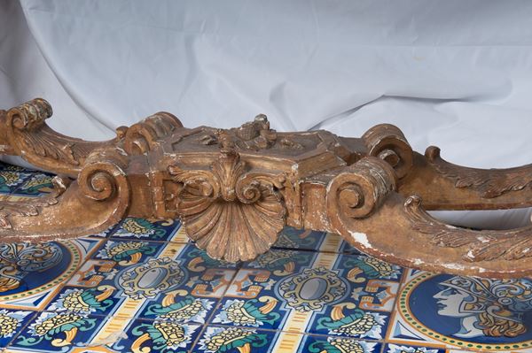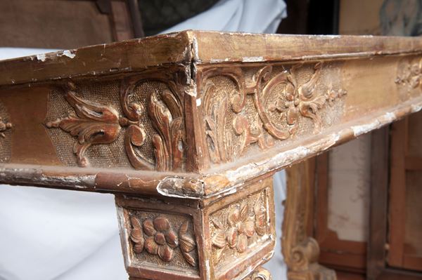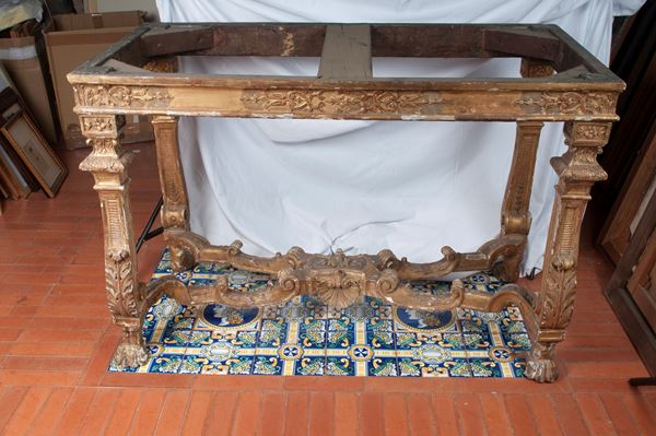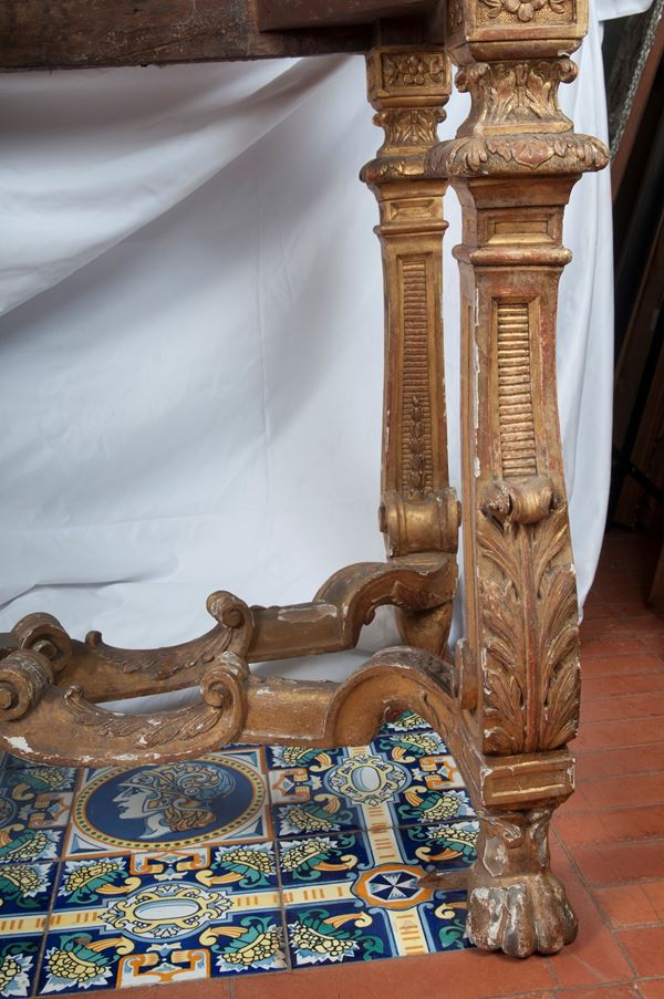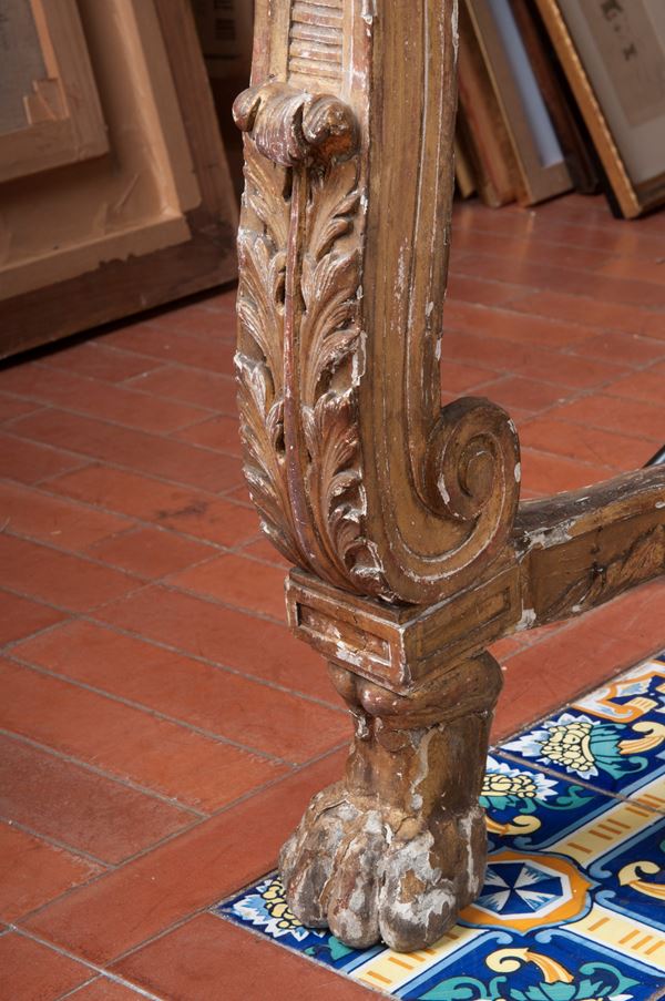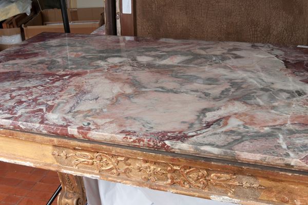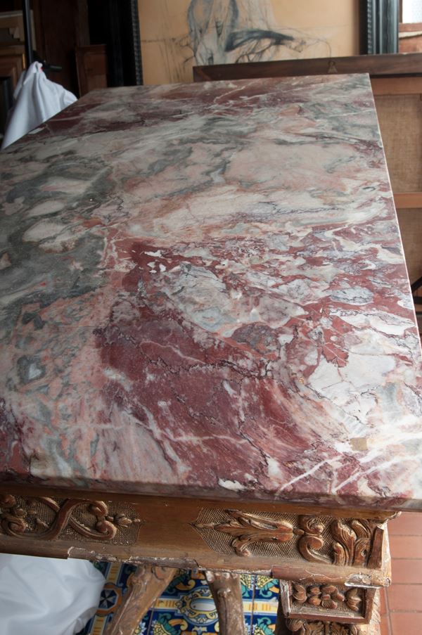 with plant motifs. Zoomorphic support foot connected to the base by a crossed motif. Breccia delle Alpi marble top.